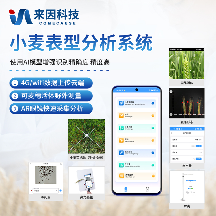 4)麦穗形态测定仪依托手机视觉技术,通过AI图像矫正算法一键获取穗长、小穗数等关键指标。全系统实现田间快速取样、批量分析及数据互联,为育种优化、产量预测和功能基因解析提供智能化解决方案。